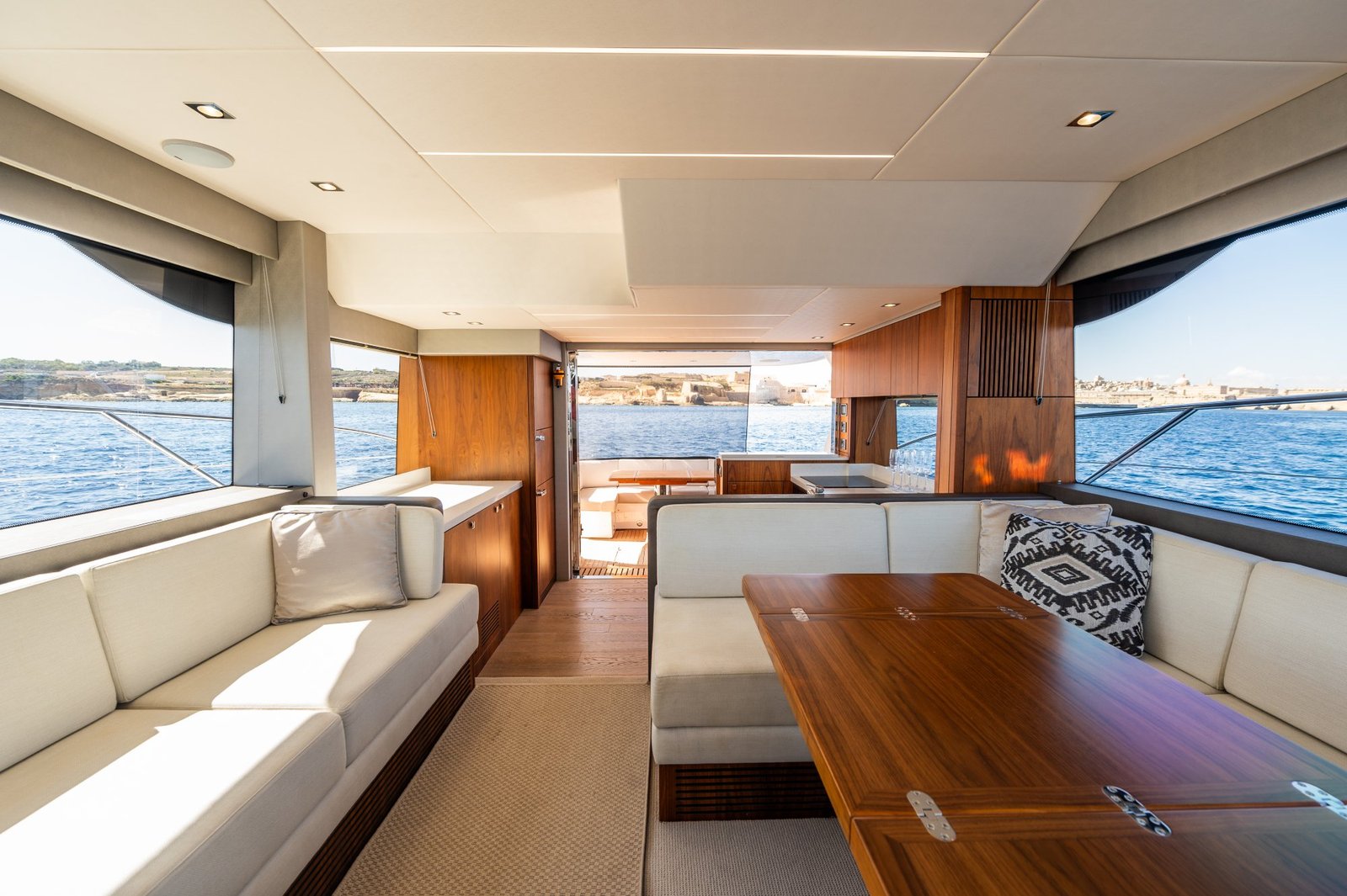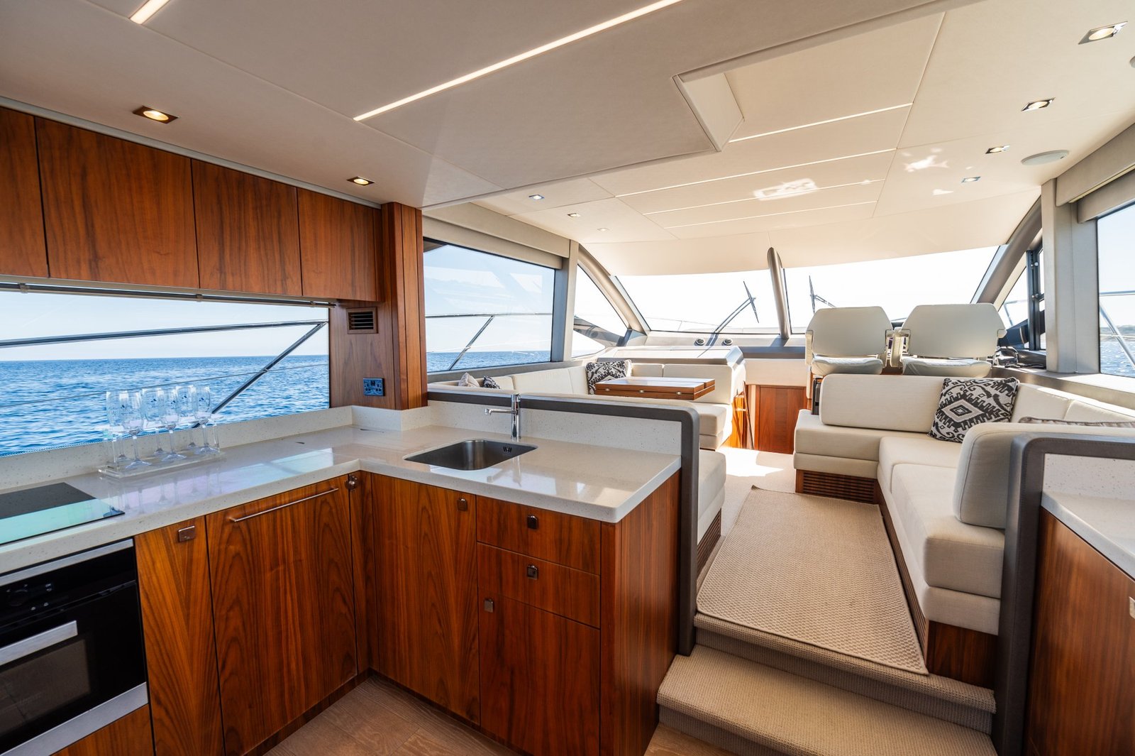 The open-plan layout includes a fully equipped galley, a stylish lounge, and state-of-the-art entertainment systems.