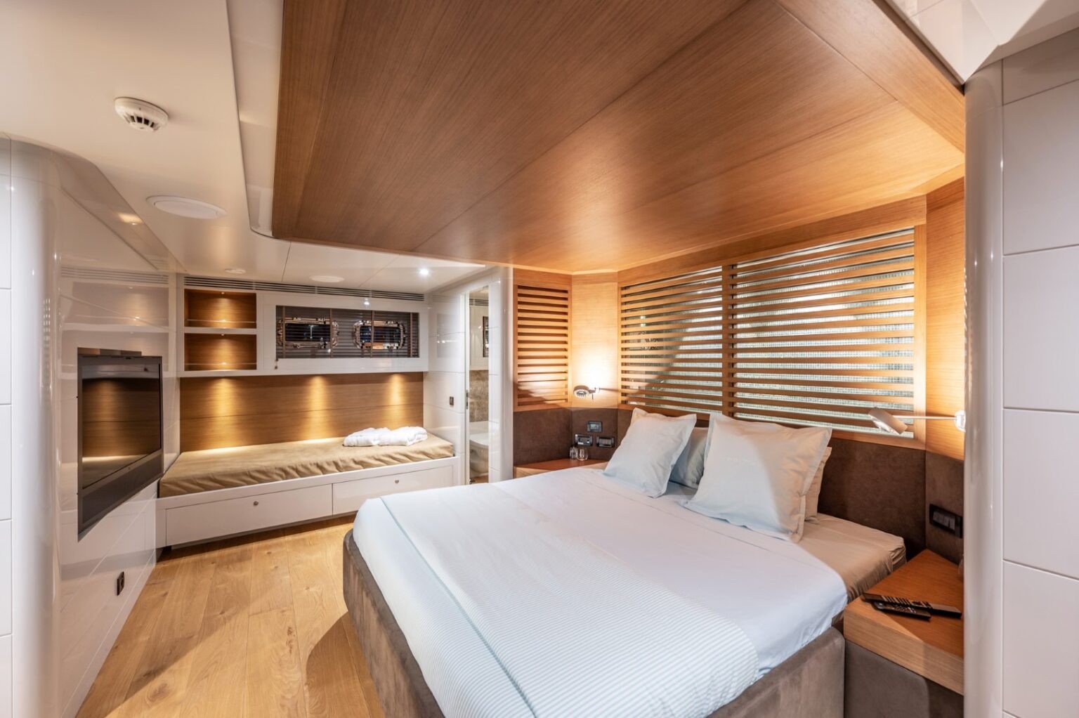 The second master stateroom is located on the lower deck amidships and features a full-beam stateroom with an additional bed ideal for a child.